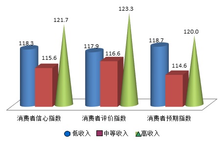 本季度分年龄段的调查结果为,老年群体的指数相对较高,依次分别为128.7点、127.0点和130.4点,环比变化幅度也较小;中间年龄段的消费者在三项主要指数中均垫底,得分分别为117.5点、118.5点和116.5点,相比上个季度下降幅度较大,为6.2点、5.8点和6.6点;青年消费群体的各项指数居中,分别为120.6点、122.5点和118.7点,相比上个季度变化不大,分别为0.8点、1.7点和-0.1点。同时调查组分析发现,年轻消费者和老年消费者的购买类指数环比出现了较大幅度的上涨,而中年消费群体购买意愿和购买预期并没有显著增强,同时其收入类指数和就业类指数在高位处环比都有下降,收入评价指数环比减少13.5点,就业预期指数环比降低18.3点。综上,中等收入群体和中年消费者社会活动和经济发展中发挥着重要的作用,其对经济发展的信心对于推动经济稳定和结构转型的平稳过渡至关重要,但本次调查结果反应出两类群体对经济发展中的不确定性都有所担忧,且对收入现状不如前期乐观,因此应适当考虑采取必要的措施稳定其信心,使两类群体对未来的就业和收入形成较为平稳的预期。