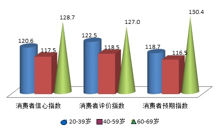 调查数据发现,本季度高收入消费者各项指数均高于中等收入和低收入群体,但低收入群体各项指数波动不大,消费者评价指数环比增加了1.1点,是图中唯一环比为正的指数;高收入群体三项指数环比分别下降了2.8点、1.9点和3.6点;中等收入群体的主要指数仍处于最低点,环比分别减少了2.3点、3.1点和1.6点。从具体的分类指数的表现来看,低收入群体的购买意愿指数环比出现了大幅上涨,为23.0点;而中等收入群体的收入评价指数下降幅度最大,为26.4点;而老年群体的各项分类指数相对稳定,没有出现大幅波动。说明低收入群体的购买意愿较为强烈,但其购买能力相对有限,而中等收入群体在社会和家庭中都是中坚力量,这部分群体对收入现状的评价大幅降低,同时就业类指数也从高位有所下降,这会在一定程度上影响其对经济发展的信心,因此针对该群体的就业结构和收入现状应给予关注。