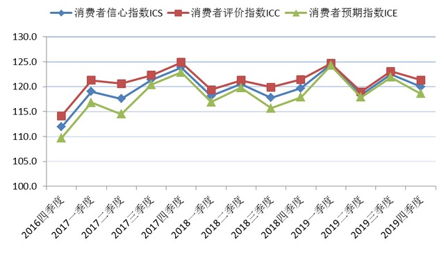 根据上海社会调查研究中心上财分中心和上海财经大学应用统计研究中心最新调查结果显示,2019年第四季度上海财经大学上海市消费者信心指数为120.0点,环比下降了2.5点,同比基本持平,略升0.3点。其中,消费者评价指数为121.4点,与上季度相比下降了1.7点;同比基本持平。消费者预期指数为118.6点,环比亦下降了3.2点,同比上升0.7点。各季度上海财经大学上海市消费者信心指数的具体指数值参见附表一。大部分的指数在本季度环比出现回调,尤其是收入类和就业类指数,相对回调幅度较大,但总体来看仍然处于年内的较高水平。在世界经济增速放缓,关税增加等复杂的经济环境中,国内经济都能冷静应对且稳定增长,使消费者对国内以及上海市经济的发展保有信心,所以本季度消费者信心指数仍然处于高位运行。