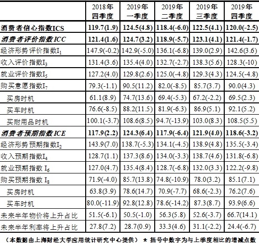 附表一 2019年第四季度上海财经大学上海市消费者信心指数及分类指数