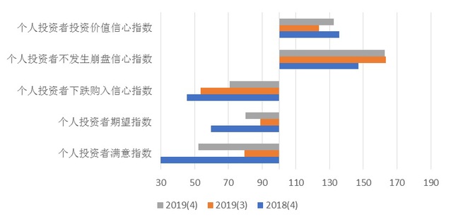 根据上海社会调查研究中心上财分中心和上海财经大学应用统计研究中心的调查,2019年第四季度上海市个人投资者信心指数为99.68点,环比下降2.15点,同比上升16.14点。本季度该指数由乐观区域转为悲观区域,表明上海市个人投资者群体对投资市场的心态转向消极,但该指数明显高于2018年第四季度。