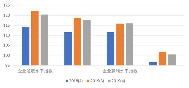 上海财经大学应用统计研究中心主任徐国祥教授和统计与管理学院常宁教授分析指出,上海市企业家投资信心指数反映企业家对于本企业生产经营现状的满意程度和对未来的预期。如图4所示,本季度企业家投资信心指数的分类指数中除企业盈利水平指数与上季度基本持平外,其他三个指数的环比呈现小幅回落,但同比皆为上升。其中表现当前企业发展状况的企业发展水平信心指数为120.31点,与上季度相比下降1.85点,同比上升6.08点;反映企业销售水平的企业销售水平信心指数是为117.74点,环比下降1.06点,同比上升6.18;企业盈利水平信心指数为115.92点,环比持平,同比上升4.39点。企业预期发展水平信心指数为100.52点,较前一季度下降1.10点,同比上升3.86点,但仍处于乐观区域。整体来看,企业家投资信心指数微降,对企业预期发展水平有所下降。