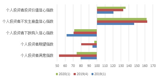 如图7所示,第一季度个人投资者信心指数的分类指数中除了不崩盘信心指数与上季度基本持平外,其余四个指数都有所上升。其中,个人投资者满意指数为74.37点,较上季度大幅上升22点,同比下降4.93点;个人投资者期望指数为96.51点,环比上升16.47点,同比上升2.18点;个人投资者下跌购入信心指数为71.53点,与上季度基本持平,同比上升9.63点;个人投资者不崩盘信心指数为162.23点,与前一季度持平,同比上升15.57点;本季度个人投资价值信心指数为135.64点,环比上升3.05点,同比上升15.08点。
