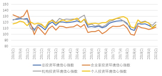 如图2所示,本季度投资环境信心指数的三个分类指数均呈现上升状态,与去年同期相差不大。其中,企业家投资环境信心指数为111.94点,环比上升2.48点,同比基本持平;机构投资者投资环境信心指数为120.64点,环比上升5.85点,同比持平;个人投资者投资环境信心指数为115.51点,环比上升5.01点,同比下降3.33点。