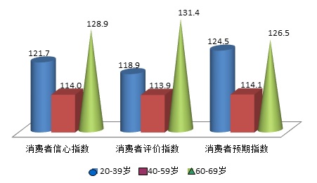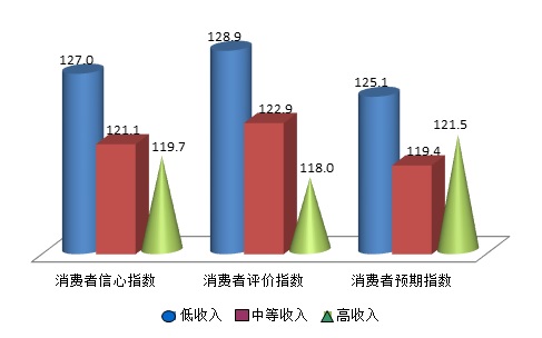 根据上海财经大学应用统计研究中心和上海社会调查研究中心上财分中心根据上海财经大学应用统计研究中心最新调查结果分析显示,消费者的消费信心随不同收入水平和不同年龄段呈现出不同水平。本季度消费者信心基本呈现出随收入增加而下降的趋势,本季度上海市低、中、高收入者的消费信心指数分别为127.0点、121.1点和119.7点,消费者评价指数的情况为:低收入群体为128.9点,中等收入消费者为122.9点,高收入消费者为118.0点;而消费者预期指数低、中、高收入群体分别为125.1点、119.4点和121.5点。三个收入群体的各主要指数均远高于中性值100点,但比较而言,低收入群体的各项指数都领先于其他两个群体,且差距较大。
