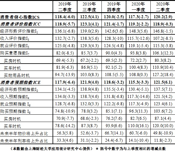 附表一 2020年第二季度上海财经大学上海市消费者信心指数及分类指数