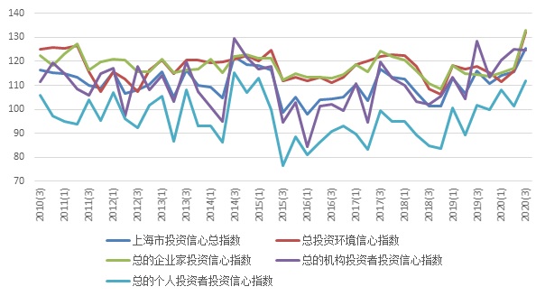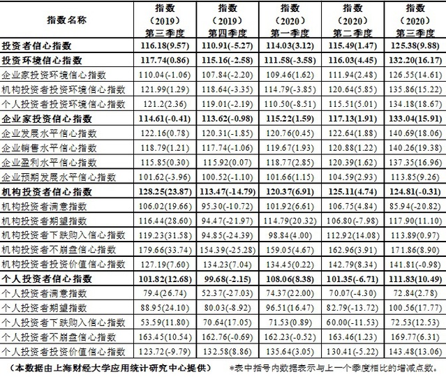 根据上海财经大学应用统计研究中心和上海社会调查研究中心上财分中心对上海市企业领导人或企业家、机构投资者和个人投资者的调查结果显示,2020年第三季度上海财经大学上海市投资者信心指数为125.38点,环比上升9.88点,同比上升9.19点。指数大幅上升,表明上海市投资者信心较前期明显增强。