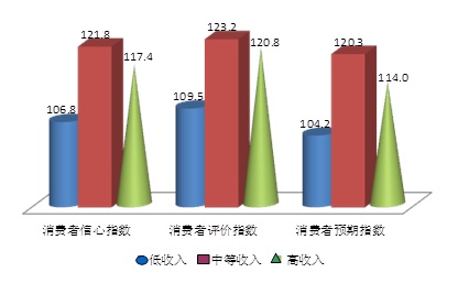 上海财经大学应用统计研究中心主任徐国祥教授、崔畅副教授和吴纯杰副教授分析指出,调查数据发现,本季度在全体被调查者的各项主要指数环比大多为负的情况下,中等收入群体的各主要指数出现了环比大幅上涨,消费者信心指数、消费者评价指数和预期指数的上涨幅度分别为9.9点、8.6点和11.2点,而低高收入群体的主要指数则环比下降,因此进一步拉大了中低收入群体的距离。特别是本季度中等收入群体的各项分类指数环比均为正值,而低高收入群体的各项分类指数的环比变化则呈现出较大的差异,低收入群体的收入评价指数和收入预期指数大幅下滑,环比分别下降16.9点和11.6点,加之高企的房价,导致该群体的耐用品购买意愿指数和购买预期指数较上个季度分别下降了17.0点和17.4点。说明对低收入群体的关注度急需加强,一方面应针对该群体的就业特点实行有针对性的就业培训和扶持,从而带动其收入的提高;另一方面要进一步加强社会保障体系建设,使低收入群体的社会归属感和安全感增强,切实提高其生活保障。
