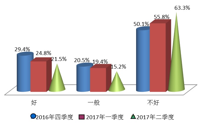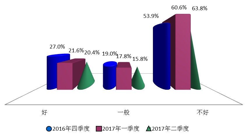 根据上海财经大学应用统计研究中心和上海社会调查研究中心上财分中心最新调查结果显示,2017年第二季度上海市消费者买房时机指数为56.6点,环比下降了4.4点;买房时机预期指数58.2点,环比大幅下降10.9点,是本季度下降幅度最大的分类指数。本季度上海市房地产市场持续低迷,观望气氛蔓延,但价格未见明显回落,导致消费者的买房意愿和买房预期均有大幅下降。
