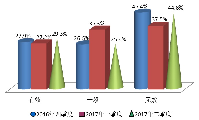 在本季度的调查中,29.3%的受访者认为房地产市场调控的政策有效,环比上升2.1个百分点,比去年同期提高了4.8个百分点;同时,44.8%的消费者对该项工作的评价投了不满意票,比上季度上升了7.3个百分点,同比下降了5.0个百分点,本季度消费者对调控效果的态度出现了分歧,投满意票和不满意票的消费者都有所提高。本季度并没有新的具体房地产调控政策出台,但上一季度实施的最严厉的调控政策效果逐步显现,有效地提高了投机成本并减少了市场需求,上海楼市呈现迅速冻结的状态,使得消费者对房价下行的预期增强,同时也有更多的消费者对政府房地产市场调控工作投了满意票。但上海作为一线城市仍然面临较大房价上涨压力,本次调控后房价未现明显回落,而调控政策仍以限购限贷等短期政策为主,缺乏长期的制度建设来发挥市场自发的调节作用,因此也有部分消费者对此投了不满意票。