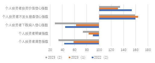 如图7所示,本季度个人投资者信心指数的分类指数呈现四降一升态势,其中,个人投资者满意指数为33.54点,环比下降24.73点,同比下降9.29点;个人投资者期望指数为73.73点,环比下降9.18点,同比下降16.08点;个人投资者下跌购入信心指数为27.69点,环比下降34.81点,同比下降17.01点;个人投资者不崩盘信心指数为159.26点,环比下降4.57点,同比持平;本季度个人投资价值信心指数为134.62点,环比上升3.69点,同比下降19.16点。