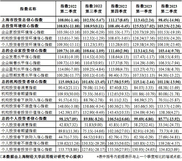 根据上海社会调查研究中心上财分中心和上海财经大学应用统计研究中心对上海市企业领导人或企业家、机构投资者和个人投资者的调查结果显示,第二季度上海财经大学上海市投资者信心指数为98.45点,环比下降14.96点,同比下降9.55点。指数值回落至中性值100点以下,表明上海投资者的心态转向悲观。