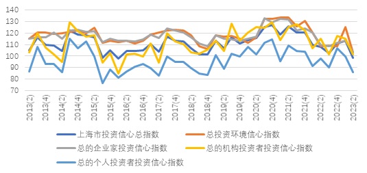 图2 上海财经大学投资者信心指数2013(2)—2023(2)各个季度核心指数运行情况图