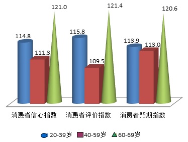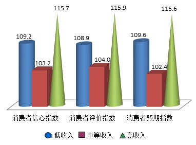 根据上海财经大学应用统计研究中心和上海社会调查研究中心上财分中心最新调查结果显示,消费者的消费信心随不同收入水平和不同年龄段呈现出不同水平。本季度低收入群体消费者信心指数为109.2点,而中高收入群体分别为103.2点和115.7点;消费者评价指数的情况为低收入群体为108.9点,中等收入消费者为104.0点,高收入消费者为115.9点,而消费者预期指数低、中、高收入群体分别为109.6点、102.4点和115.6点,各收入群体的主要指数均高于中性值,且同一收入水平内的各项指数较为接近,但值得关注的是中等收入消费者的各主要指数再次处于最低水平。