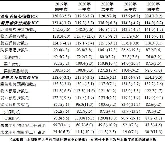 附表二 2020年第四季度上海财经大学上海市消费者信心指数及分类指数