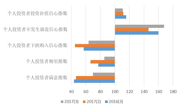 根据上海财经大学应用统计研究中心和上海社会调查研究中心上财分中心的调查,2017年三季度上海市个人投资者信心指数为99.58点,环比上升16.32点,同比上升8.74点。指数升幅明显,表明上海市个人投资者群体对投资市场的心态较前期有所回暖。