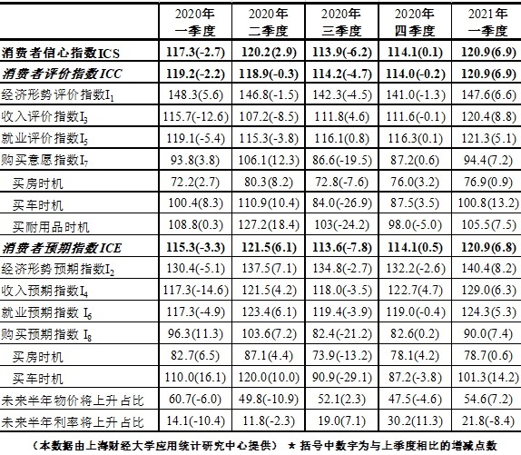 2021年第一季度上海财经大学上海市消费者信心指数及分类指数