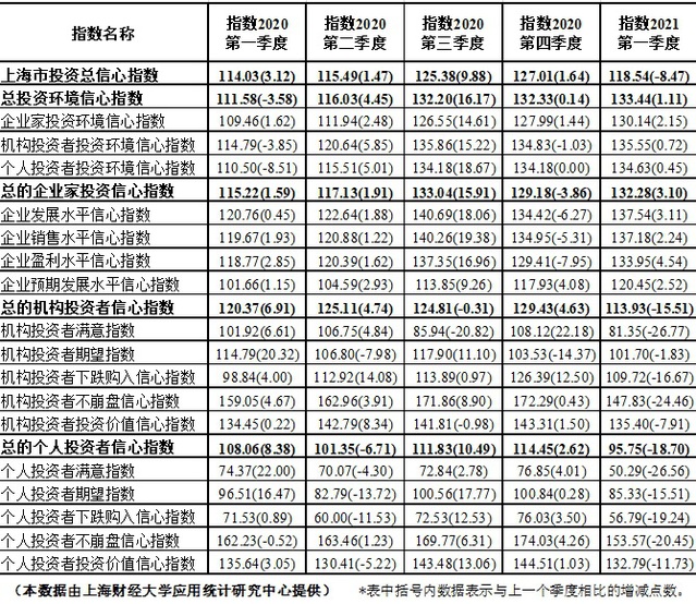 上海财经大学投资者信心指数2020年1季度-2021年1季度核心指数情况表