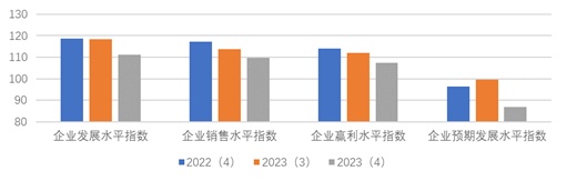 上海市企业家投资信心指数反映企业家对于本企业生产经营现状的满意程度和对未来的预期。如图4所示,本季度企业家投资信心指数的分类指数均呈现下降态势,其中表现当前企业发展状况的企业发展水平信心指数为111.15点,环比下降7.39点,同比下降7.50点;反映企业销售水平的企业销售水平信心指数为109.63点,环比下降4.16点,同比下降7.74点;企业盈利水平信心指数为107.31点,环比下降4.58,同比下降6.67点。企业预期发展水平信心指数为86.82点,环比下降12.89点,同比下降9.57点。
