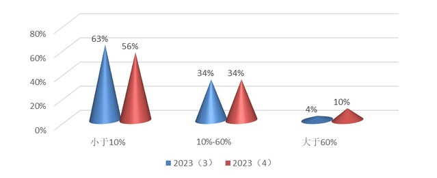 本季度个人投资者不崩盘信心指数也大幅回落。与上季度相比,在关于“您认为未来三个月内大盘指数下跌30%的概率是多少”的调查中,认为小于10%的占比从63%降至56%,认为10%-60%的占比持平,认为大于60%的占比由4%升至10%,具体如图9所示。