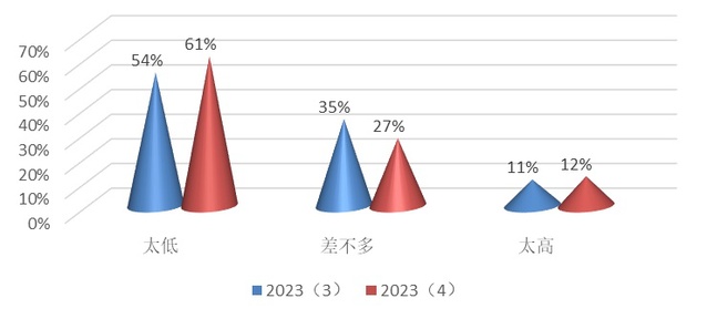 本季度机构投资者下跌购入信心指数的升幅最大。在关于“与真实的基本价值或合理的投资价值相比,您认为我国目前的上证指数如何”的调查中,认为太低的受访者占比由54%升至61%,认为差不多的受访者占比由35%降至27%,认为太高的受访者由11%升至12%,具体如图6所示。