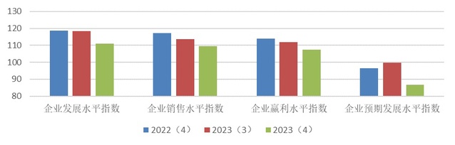 上海市企业家投资信心指数反映企业家对于本企业生产经营现状的满意程度和对未来的预期。如图3所示,本季度企业家投资信心指数的分类指数均呈现下降态势,其中表现当前企业发展状况的企业发展水平信心指数为111.15点,环比下降7.39点,同比下降7.50点;反映企业销售水平的企业销售水平信心指数为109.63点,环比下降4.16点,同比下降7.74点;企业盈利水平信心指数为107.31点,环比下降4.58,同比下降6.67点。企业预期发展水平信心指数为86.82点,环比下降12.89点,同比下降9.57点。