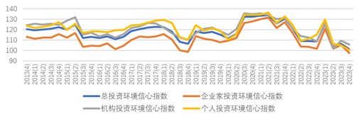 如图3所示,本季度投资环境信心指数的三个分指数均呈现下降态势:企业家投资环境信心指数为97.42点,落入悲观区域,环比下降7.76点,同比下降4.10点;机构投资者投资环境信心指数为105.60点,环比下降3.72点,同比下降3.07点;个人投资者投资环境信心指数为100.23点,环比下降4.55点,同比下降15.05点。