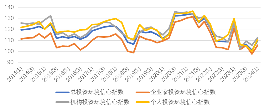 如图3所示,本季度投资环境信心指数的三个分类指数均呈现上升态势:企业家投资环境信心指数为105.36点,指数重回乐观区域,环比上升7.93点,同比下降15.37点;机构投资者投资环境信心指数为112.30点,环比上升6.70点,同比下降13.94点;个人投资者投资环境信心指数为110.65点,环比上升10.42点,同比下降18.93点。