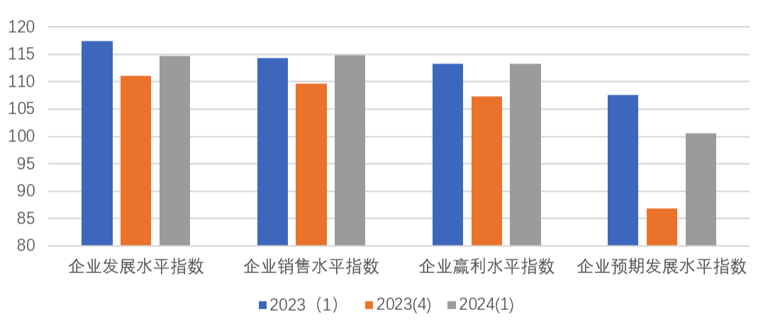 上海市企业家投资信心指数反映企业家对于本企业生产经营现状的满意程度和对未来的预期。如图3所示,本季度企业家投资信心指数的分类指数均呈现上升态势,其中表现当前企业发展状况的企业发展水平信心指数为114.72点,环比上升3.57点,同比下降2.76点;反映企业销售水平的企业销售水平信心指数为114.87点,环比上升5.25点,同比持平;企业盈利水平信心指数为113.30点,环比上升5.99点,同比持平。企业预期发展水平信心指数为100.63点,指数升至乐观区域,环比上升13.81点,同比下降6.89点。