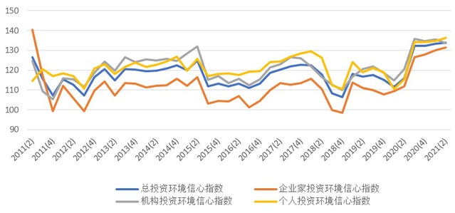 如图2所示,本季度投资环境信心指数的三个分类指数呈现两升一降:其中,企业家投资环境信心指数为131.43点,环比上升1.30点,同比上升19.49点;机构投资者投资环境信心指数为133.68点,环比下降1.87点,同比上升13.04点;个人投资者投资环境信心指数为136.36点,环比上升1.73点,同比上升20.85点。