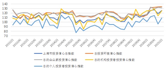 图2 上海市投资者信心指数2011年第2季度至2021年第2季度核心指数运行情况图