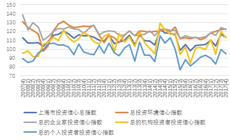 上海财经大学应用统计研究中心和上海社会调查研究中心上财分中心对上海市企业领导人或企业家、机构投资者和个人投资者的调查结果显示,2017年第四季度上海财经大学上海市投资者信心指数为113.42点,环比下降3.53点,同比上升8.18点,虽然指数小幅回落,但仍位于乐观区域,表明上海市投资者心态仍积极稳定。