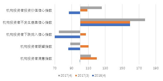 根据上海财经大学应用统计研究中心和上海社会调查研究中心上财分中心的调查,2017年四季度上海市机构投资者信心指数为112.92点,比三季度下降6.97点,同比上升13.38点。虽然本季度机构投资者对市场的看法不如前期积极,但总体仍处于乐观区域。
