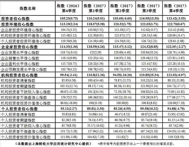 上海财经大学投资者信心指数2016年第4季度-2017年第4季度核心指数情况表