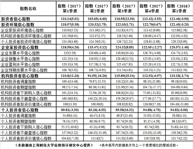 上海财经大学上海市投资者信心指数(2017年第1季度-2018年第1季度)情况表
