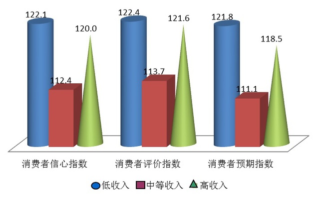 上海社会调查研究中心上财分中心主任、上海财经大学应用统计研究中心主任徐国祥教授、崔畅副教授和吴纯杰副教授分析指出,调查数据发现,本季度在全体被调查者的各项主要指数环比均为下降,但高收入群体相对下降幅度较小,分别为4.7点、5.1点和4.4点,且从历次调查结果来看,该收入消费群体的调查结果较为稳定,也体现了高收入群体对抗各种不确定性的能力较强;中等收入群体的主要指数在本季度继续垫底,环比大幅下降了8.2点、7.4点和9.0点,并进一步拉大了和其他两个群体的距离,中等收入群体的各项指数已经连续三个季度位于三者的最低点位,反映出在国内经济结构转型、楼市胶着、股市不振和外部经济环境冲击的背景下,中等收入群体面临的医疗、养老、住房和教育等问题和压力逐步正凸显出来,中等收入陷阱问题应再度引起关注;低收入群体各项主要指数环比也出现了较大幅度的下降,但在三个群体中仍然表现最好。本季度三个收入群体的调查结果呈现了不同的特点和排列,说明在经济运行的不同阶段各个收入群体在其中所受到的影响也各不相同,因此应根据经济环境的特点针对不同的消费群体做出有针对性的辅助措施。