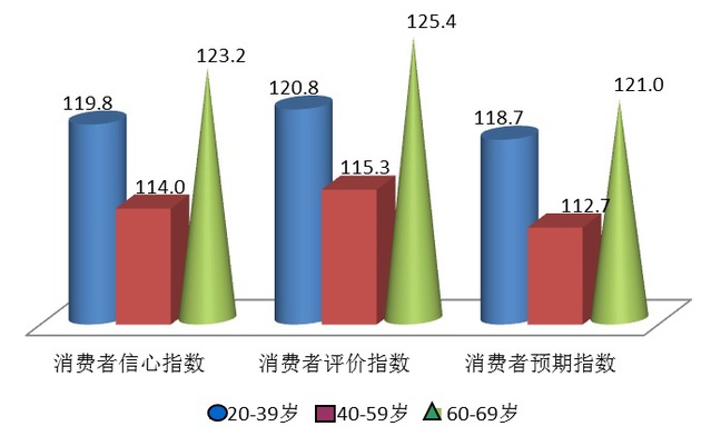 上海社会调查研究中心上财分中心主任、上海财经大学应用统计研究中心主任徐国祥教授、崔畅副教授和吴纯杰副教授分析指出,在分年龄段的调查中,老年消费群体在三项指数中数值最高,分别为123.2点4、125.4点和121.0点;而40—59岁年龄段消费者的各项指数均垫底,信心指数、评价指数和预期指数分别为114.0点、115.3点和112.7点;20—39岁年龄组的各项指数居中分别为119.8点、120.8点和118.7点。20—39岁和40—59岁年龄段的三项主要指数环比均下降,但40—59岁年龄段下降幅度更大,分别为8.0点、8.6点和7.4点,其中对就业的评价和预期尤其明显,两项指数环比分别大幅下降了11.0点和15.2点,说明中年群体的就业状况比较容易受到结构调整和外部经济冲击的影响;而60-69岁的老年消费者对经济发展预期明显乐观,各项分类指数环比大多为正,特别是购买意愿和购买预期指数大幅提高,环比分别15.9点和26.4点。老年消费者的主要指数超越了其他两类群体的现象在以往调查中较为少见,这一方面说明上海市在养老等保障制度方面较为完善,同时也应看到社会经济中的活跃群体对收入和就业问题的担忧。