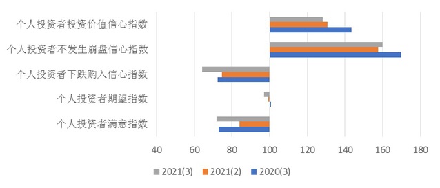 如图7所示,本季度个人投资者信心指数的分类指数除个人投资者不崩盘信心指数小幅上升外,其余指数均呈下降态势。其中,个人投资者满意指数为71.89点,较上季度下降12.23点,同比基本持平;个人投资者期望指数为96.96点,环比下降2.20点,同比下降3.60点;个人投资者下跌购入信心指数为64.21点,比上季度下降10.46点,同比下降8.32点;个人投资者不崩盘信心指数为159.92点,比前一季度上升2.36点,同比下降9.85点;本季度个人投资价值信心指数为128.14点,环比下降2.52点,同比下降15.34点。