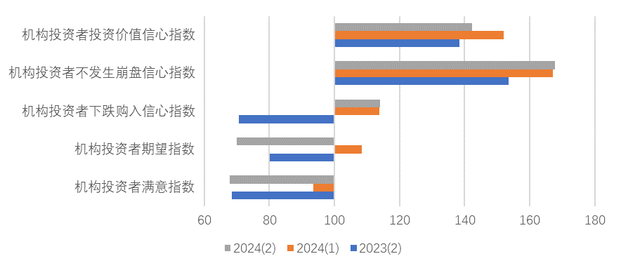 如图4所示,机构投资者信心指数的分类指数呈现三降两持平态势。其中,机构投资者满意指数为67.91点,环比下降25.63点,同比基本持平,略降0.47点;机构投资者期望指数为70.01点,指数落入悲观区域,环比下降38.42点,同比下降10.07点;机构投资者下跌购入信心指数为114.00点,环比基本持平,略升0.3点,同比上升43.49点;本季度机构投资者崩盘信心指数为167.74点,环比基本持平,略升0.63点,同比上升14.17点;本季度机构投资者投资价值信心指数142.31点,环比下降9.80点,同比上升3.95点。