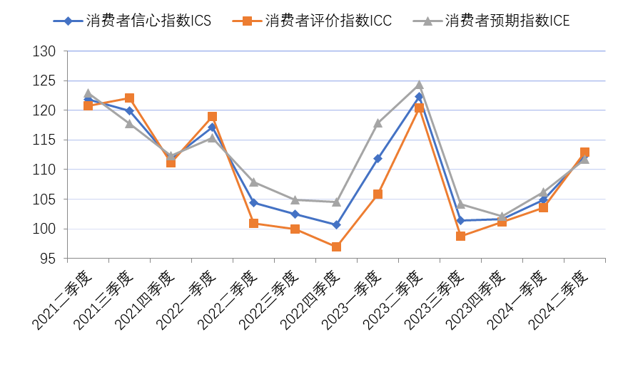 根据上海社会调查研究中心上财分中心和上海财经大学应用统计研究中心最新调查结果显示,2024年第二季度上海财经大学上海市消费者信心指数为112.3点,环比上升7.5点,但同比仍然下降10.1点。其中,消费者评价指数为112.9点,较上个季度上涨9.4点,同比下降7.5点;消费者预期指数为111.7点,环比上升5.6点,同比下降幅度较大,为12.6点。各季度上海财经大学上海市消费者信心指数的具体指数值参见表一。总体来看本季度各项主要指数环比继续回升,但仍然没有达到去年同期的水平。在过去的一个季度里,全国和上海市经济发展较为平稳,经济形势总体向好,使得消费者对本季度上海市经济的满意度稳步上升。