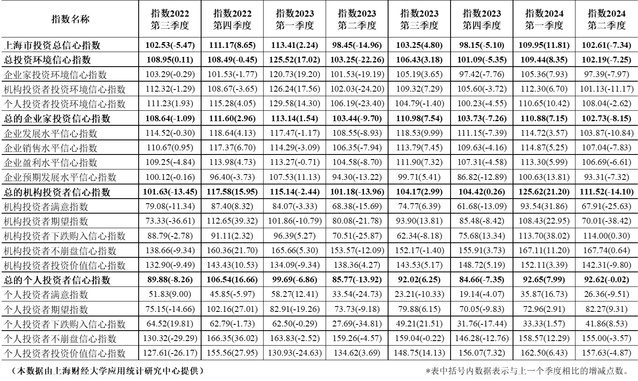 上海财经大学投资者信心指数2022年第3季度-2024年第2季度核心指数情况表