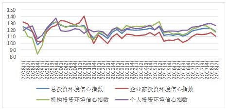 上海财经大学上海市投资者信心指数由一个指数系统组成,包括了投资环境信心指数、企业家投资信心指数、机构投资者信心指数和个人投资者信心指数等四大核心指数,四大核心指数又由17个分类指数构成。各季度上海财经大学上海市投资者信心指数的具体运行情况参见图2。