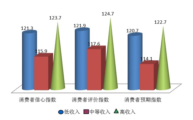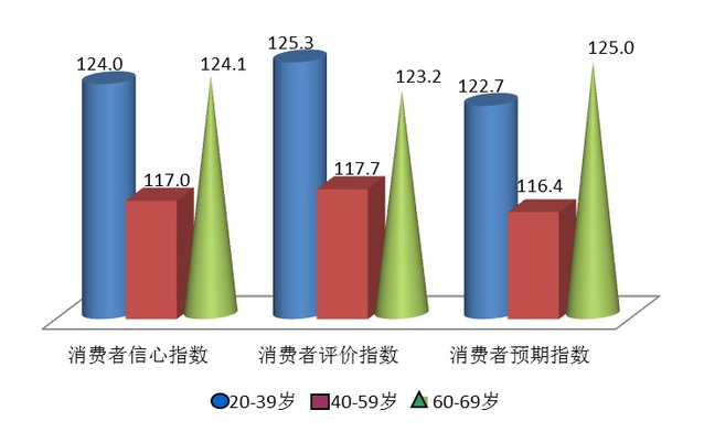 根据上海社会调查研究中心上财分中心和上海财经大学应用统计研究中心最新调查结果显示,消费者的消费信心随不同收入水平和不同年龄段呈现出不同水平。本季度高等收入群体在三个主要指数中再次领跑,均超过了中低收入群体,这在历次调查中较为少见。本季度上海市低中高收入者的消费信心指数分别为121.3点、115.9点和123.7点,消费者评价指数的情况为:低收入群体为121.9点,中等收入消费者为117.6点,高收入消费者为124.7点;而消费者预期指数低中高收入群体分别为120.7点、114.1点和122.7点。三个收入群体的各主要指数均远高于中性值,但比较而言,中等收入群体的各项指数与低收入和高收入群体的差距较大,对此现象应给予必要的关注。