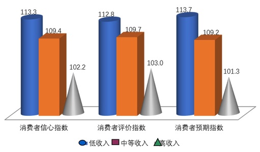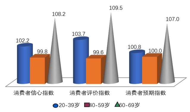 上海社会调查研究中心上财分中心主任、上海财经大学应用统计研究中心主任徐国祥教授统计与管理学院吴纯杰教授、崔畅副教授分析指出,在分年龄段的调查中,本季度60—69岁的消费者在三项主要指数中综合表现最好,分别为108.2点、109.5点和107.0点,高于其他年龄段的群体,说明该群体对于经济发展的态度最为乐观;而中间年龄段的各项主要指数综合来看表现最差,分别为99.8点、99.6点和100.0点,分类指数中就业评价指数和就业预期指数环比下降幅度最大,分别为19.7点和13.0点,说明该群体的就业形势较为严峻,且对未来的就业表现出担忧;青年群体即20—39岁年龄组的各项主要指数整体居中,分别为102.2点、103.7点和100.8点,但其收入类和就业类指数环比下降幅度较大,特别是就业预期指数环比大幅下降了22.5点,而青年群体是社会和经济发展的能量储备,同时也是引领消费的主力军,提升其就业能力和机会会为稳定经济和拉动内需提供重要保障。
