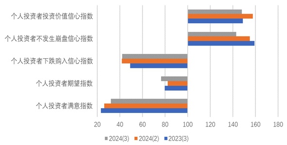 上海财经大学上海市投资者信心指数由一个指数系统组成,包括了投资环境信心指数、企业家投资信心指数、机构投资者信心指数和个人投资者信心指数等四大核心指数,四大核心指数又由17个分类指数构成。各季度上海财经大学上海市投资者信心指数的具体运行情况见图42024年第三季度上海市投资者信心指数的四大核心指数除企业家投资信心指数外,其余均呈现下降态势。