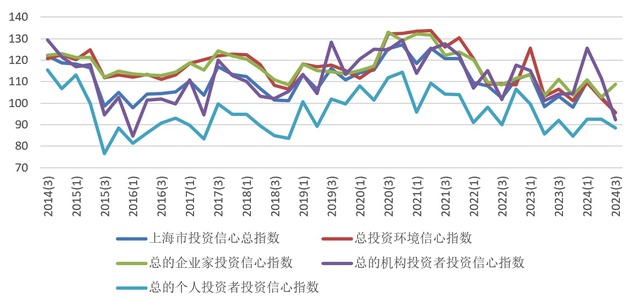 上海财经大学上海市投资者信心指数由一个指数系统组成,包括了投资环境信心指数、企业家投资信心指数、机构投资者信心指数和个人投资者信心指数等四大核心指数,四大核心指数又由17个分类指数构成。各季度上海财经大学上海市投资者信心指数的具体指数值参见附表二,运行情况参见图1。2024年第三季度上海市投资者信心指数的四大核心指数除企业家投资信心指数外,其余均呈现下降态势。