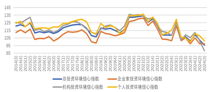 上海财经大学上海市投资者信心指数由一个指数系统组成,包括了投资环境信心指数、企业家投资信心指数、机构投资者信心指数和个人投资者信心指数等四大核心指数,四大核心指数又由17个分类指数构成。各季度上海财经大学上海市投资者信心指数的具体运行情况见图4,2024年第三季度上海市投资者信心指数的四大核心指数除企业家投资信心指数外,其余均呈现下降态势。