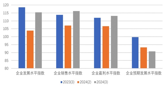 上海市企业家投资信心指数反映企业家对于本企业生产经营现状的满意程度和对未来的预期。如图6所示,本季度企业家投资信心指数的分类指数呈现三升一降态势,其中表现当前企业发展状况的企业发展水平信心指数为115.34点,环比上升11.47点,同比下降3.19点;反映企业销售水平的企业销售水平信心指数为116.10点,环比上升9.06点,同比上升2.31点;企业盈利水平信心指数为113.11点,环比上升6.44点,同比上升1.23点。企业预期发展水平信心指数为90.72点,环比下降2.59点,同比下降8.99点。
