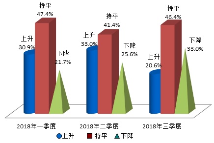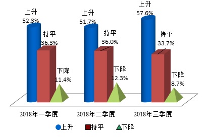 本季度消费者在通胀预期有所增加的同时,对加息的预期反而大幅下降。认为未来6个月内利率“会上升”的受访者由上季度的33.0%下降到20.6%,下降幅度较大为12.4个百分点;持“保持不变”看法的比例为46.4%,与上季度相比增加了5.0个百分点;而33.0%的受访者认为未来6个月内利率会下降,环比增加了7.4个百分点,是近两年来的最高点位。本次调查结果显示有近半数的消费者认为未来六个月利率会保持不变,而仅有五分之一的消费者预期未来6个月内利率会上升,对此上海财经大学徐国祥教授和崔畅副教授指出,目前虽然中美贸易摩擦持续化,美国又于近期加息,汇率等各方面的压力增大,但国内的主要任务还是稳增长和扩内需,而且主要资本市场低迷,加息无异于雪上加霜,因此跟进加息的可能性确实不大。