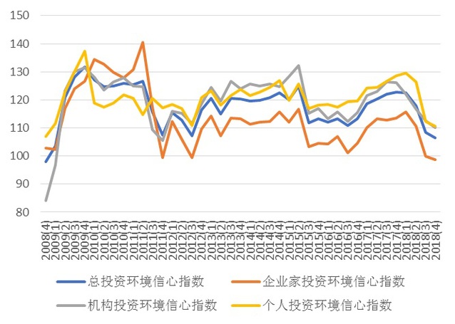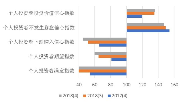 (四)2018年第四季度上海市个人投资者信心指数为83.54点,环比下降1.39点,同比下降11.34点,指数处于悲观区域,连续性数个季度的下降表明上海市个人投资者群体对投资市场的心态较为悲观。